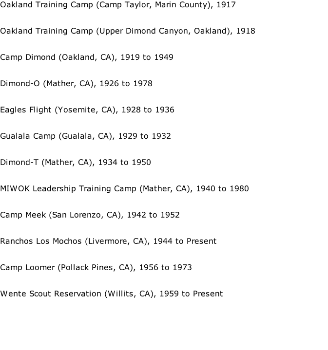 Oakland Area Council Patch (c 1950) San Francisco Bay Area Council History B S A B S A Los Mochos Symbol, Oakland Area Council (1945 - Present) Camp Loomer Symbol, Oakland Area Council (1957 - 1973) TC San Francisco Training Camp symbol, San Francisco Council (1917 - 1924) Camp Moore symbol, San Francisco Council (1938 - 1951) Camp Lilienthal Symbol (Fairfax location), San Francisco Council (1928 - 1973) Camp Royaneh symbol, San Francisco Council (1925 - Present) Camp Lilienthal (Stern Grove location) Symbol, San Francisco Council (1919 - 1925) Boy Scouts of America, San Francisco Bay Area Council • 1001 Davis Street, San Leandro, CA 94577-1514, (510) 577-9000  |  Contact Webmaster Oakland Area Council Camps 1916 - 1964 The following are the training camps or Scout Camps of the Oakland Area Council which merged to become the San Francisco Bay Area Council in 1964: Patches / Memorabilia Council Execs / Presidents Denotes the camp is still active Gualala Camp Patch (c 1932) Camp Dimond Patch (c 1942) Lagunitas Training Camp Upper Dimond Training Camp Camp Dimond Dimond-O Gualala Camp Camp Meek Ranchos Los Mochos Camp Loomer Scout Reservation Dimond-T EaglesFlight Boy Scouts of America, San Francisco Bay Area Council • 1001 Davis Street, San Leandro, CA 94577-1514, (510) 577-9000 MIWOK Training Patch (c 1950) MIWOK