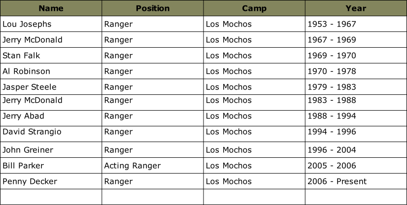 Oakland Area Council Patch (c 1950) San Francisco Bay Area Council History B S A B S A Los Mochos Symbol, Oakland Area Council (1945 - Present) Camp Loomer Symbol, Oakland Area Council (1957 - 1973) TC San Francisco Training Camp symbol, San Francisco Council (1917 - 1924) Camp Moore symbol, San Francisco Council (1938 - 1951) Camp Lilienthal Symbol (Fairfax location), San Francisco Council (1928 - 1973) Camp Royaneh symbol, San Francisco Council (1925 - Present) Camp Lilienthal (Stern Grove location) Symbol, San Francisco Council (1919 - 1925) Boy Scouts of America, San Francisco Bay Area Council • 1001 Davis Street, San Leandro, CA 94577-1514, (510) 577-9000  |  Contact Webmaster Ranchos Los Mochos Camp Staff / Rangers 1944 - Present Patches / Memorabilia Historical Documents Los Mochas Patch (c 1968) Boy Scouts of America, San Francisco Bay Area Council • 1001 Davis Street, San Leandro, CA 94577-1514, (510) 577-9000 Todd & Penny Decker Jerry McDonald Stan Falk Al Robinson Jasper Steele Lou Joseph's, Los Mochos Camp Ranger, c 1961
