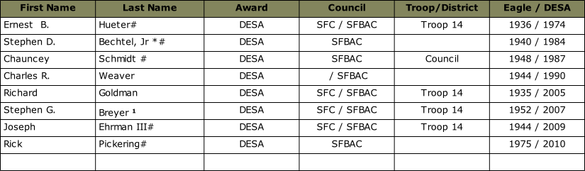 The Distinguished Eagle Scout Award (DESA) is a distinguished service award of the Boy Scouts of America (BSA). It is awarded to an Eagle Scout for distinguished service in his profession and to his community for a period of at least twenty-five years after attaining the rank of Eagle Scout. Other requirements include significant accomplishment in one's career and a solid record of continued community volunteer involvement. It is the only BSA award given to adults that is dependent upon the recipient's association in the BSA as a youth. Recipients are known as Distinguished Eagle Scouts.