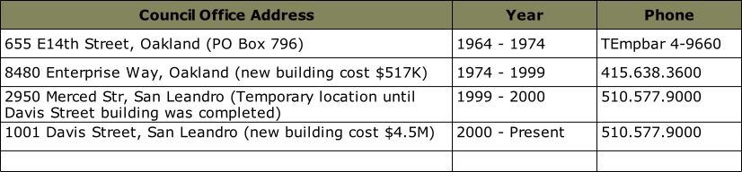 San Francisco Bay Area Council History B S A B S A Los Mochos Symbol, Oakland Area Council (1945 - Present) Camp Loomer Symbol, Oakland Area Council (1957 - 1973) TC San Francisco Training Camp symbol, San Francisco Council (1917 - 1924) Camp Moore symbol, San Francisco Council (1938 - 1951) Camp Lilienthal Symbol (Fairfax location), San Francisco Council (1928 - 1973) Camp Royaneh symbol, San Francisco Council (1925 - Present) Camp Lilienthal (Stern Grove location) Symbol, San Francisco Council (1919 - 1925) Boy Scouts of America, San Francisco Bay Area Council • 1001 Davis Street, San Leandro, CA 94577-1514, (510) 577-9000  |  Contact Webmaster San Francisco Bay Area Council Council Office Locations 1964 - Present First Location of Headquarters  San Francisco Bay Area Council 655 East 14th, Oakland 1964 - 1974 Second Location of Headquarters  San Francisco Bay Area Council 8480 Enterprise Way, Oakland 1974 - 1999 Current Location of Headquarters  San Francisco Bay Area Council 1001 Davis Street, San Leandro 2000 - Present Pictures Council Districts