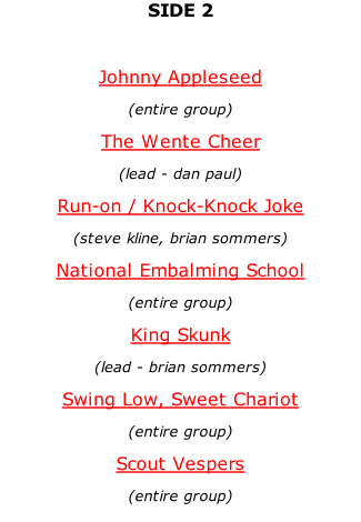 Oakland Area Council Patch (c 1950) San Francisco Bay Area Council History B S A B S A Los Mochos Symbol, Oakland Area Council (1945 - Present) Camp Loomer Symbol, Oakland Area Council (1957 - 1973) TC San Francisco Training Camp symbol, San Francisco Council (1917 - 1924) Camp Moore symbol, San Francisco Council (1938 - 1951) Camp Lilienthal Symbol (Fairfax location), San Francisco Council (1928 - 1973) Camp Royaneh symbol, San Francisco Council (1925 - Present) Camp Lilienthal (Stern Grove location) Symbol, San Francisco Council (1919 - 1925) Boy Scouts of America, San Francisco Bay Area Council • 1001 Davis Street, San Leandro, CA 94577-1514, (510) 577-9000  |  Contact Webmaster Wente Scout Reservation Songs of the Wente Staff Summer 1985 Miscellaneous Boy Scouts of America, San Francisco Bay Area Council • 1001 Davis Street, San Leandro, CA 94577-1514, (510) 577-9000 Music Director & Vocals Coach: Dan Paul  Acoustic Guitar: Dan Paul  Vocals & Background: Wente Staff Glen Phillips, Stan Pisle, Doug Styles and Brian Sommers lead Battle Cry of Freedom MP3 audio files.  Click on song titles to download songs and enjoy! Willits Scout Reservation Patch (c 1964) O-Wente.mp3 At_Camp_Wente.mp3 Froggie.mp3 Battle_Cry_of_Freedom.mp3 Be_Courteous.mp3 America.mp3 Johnny_Appleseed.mp3 The_Wente_Cheer.mp3 Jokes.mp3 National_Embalming_School.mp3 King_Skunk.mp3 Sweet_Chariot.mp3 Scout_Vespers.mp3